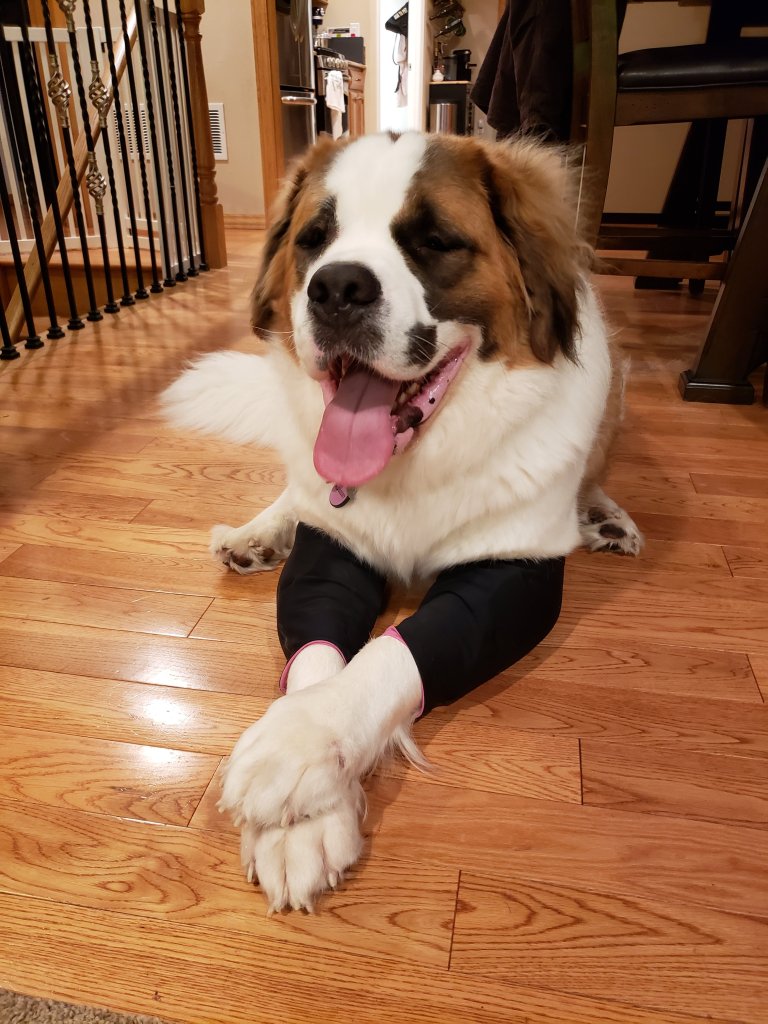 A few weeks ago, in a Saint Bernard group that Mike and I both belong to, another Saint parent shared a photo of their baby wearing leggings on their front legs. It turns out, the leggings were elbow pads, designed to protect them from developing hygromas or making existing ones worse. Well, Mia has had hygromas on both front legs since she was about 8 months old, so I was very intrigued by these pads.