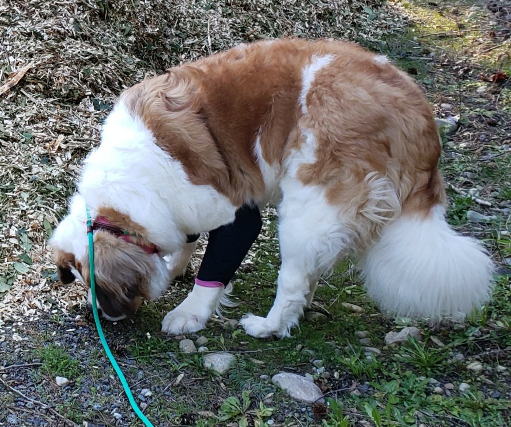 For those who aren’t familiar, hygromas are fatty, fluid filled sacs that form on joints when they are repeatedly struck against hard surfaces, such as a wood or tile floor. Mia, (like many Saints, I’ve learned) doesn’t like carpet or dog beds and prefers cool surfaces. But those cool surfaces all tend to be hard. And apparently like most other Saints, she doesn’t lay down gently, but instead throws herself down onto the floor.